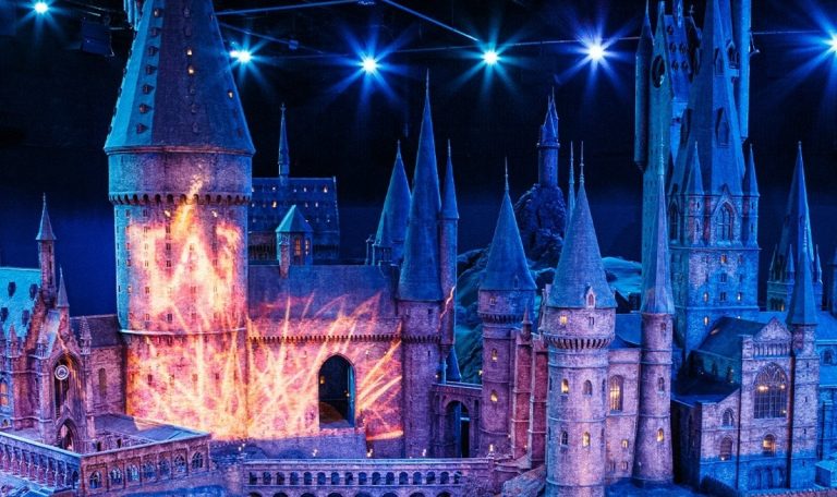 L’éclairage soigné met en valeur chaque tourelle, chaque fenêtre de cette construction spectaculaire. Les visiteurs peuvent en faire le tour complet, découvrant ainsi les moindres recoins du château sous différents angles. Cette pièce maîtresse symbolise l’aboutissement technique et artistique des studios Warner Bros.